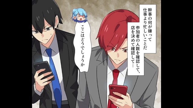 主人公は忘年会の店を選んだものの、上司から文句を言われてしまいました。 そして、忙しいからと言って幹事を断った同僚は、とても暇そうにしていたのです。