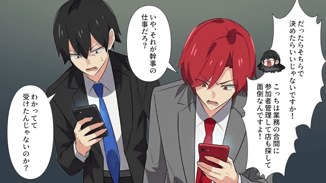主人公たちは身勝手なことばかり言う同僚に新年会の幹事を任せることにしました。 そして、自分が選んだ店に文句を言われた同僚は「だったらそちらで決めたらいいじゃないですか!」と部長たちに怒り…。