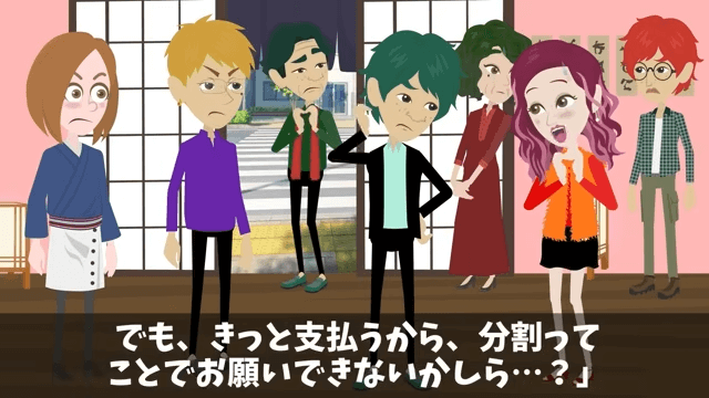 店員が同級生たちが食い逃げしようとしていたことを友人に伝えると、友人は「な、なにい?」と険しい表情になりました。 すると同級生は「冗談だったんだよ、冗談!」と言い訳を始め、同級生の妻は「きっと支払うから、分割ってことでお願いできないかしら…?」と言い出して…。