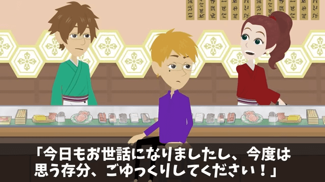事件が一件落着した後、友人は「ウチの会社の連中連れて、お前んとこの寿司屋でぜひ、忘年会をやりたいと思うんだ」と主人公に言いました。 すると店長が「今日もお世話になりましたし、今度は思う存分、ごゆっくりしてください!」と言ったのです。