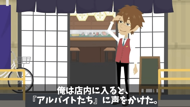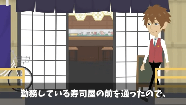 主人公は帰社する途中、同級生の息子の寿司を食べに寄ることにしました。 そして、店内に入った主人公はアルバイトたちに声をかけたのです。