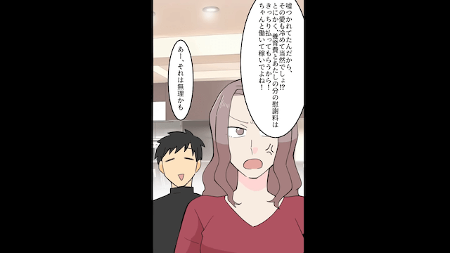 主人公のものを盗んだ犯人が浮気相手だと判明すると、夫と浮気相手は責任をなすりつけ合いました。 そんな2人に呆れた主人公が「とにかくきっちり慰謝料払ってもらうから」と告げると、浮気相手は夫に自分の分の慰謝料と養育費の支払いを要求したのです。