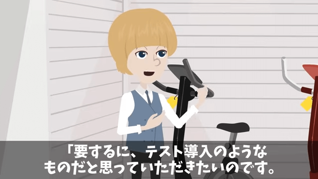 主人公はトレーニングマシンの価格が、販売予定の価格よりも安く設定してあることをオーナーに伝えます。 そして、これはテスト導入のようなものだとオーナーに説明しました。