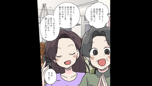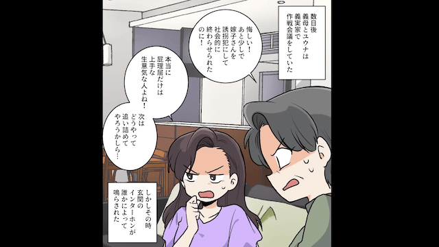 主人公が義母と義妹に「私を罠にかけて誘拐犯にするのが狙いだった?」と尋ねると、義母と義妹は焦った様子で逃げていきました。 その後、義母と義妹が主人公を陥れるための作戦会議をしていると、夫がやってきて…。