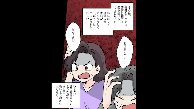 主人公夫婦にすがったものの突き放されてしまった義母と義妹は、逮捕されて罰を受けることに。 そして再び夫と結婚した主人公は、新天地で幸せに暮らしたのでした。