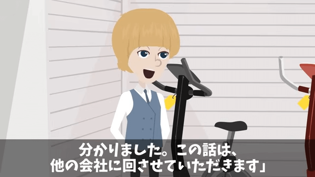 今回は『ジム開店前日…オーナー「注文したマシン全部キャンセルで(笑)」というので“全店で回収した”結果』を紹介します。 トレーニングマシンの価格に納得できなかったオーナーは「そんな値段じゃあ買えないな!」と主人公に言いました。 それを聞いた主人公は、オーナーとの交渉を諦めることにして…。