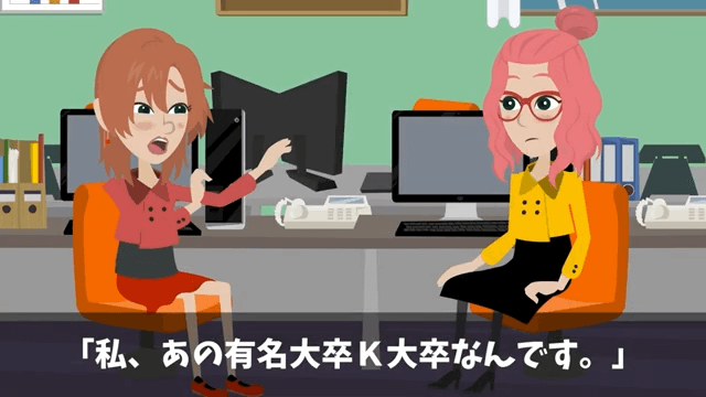 主人公が高卒だと知った後輩は「高卒!?そんな人が先輩なんて!」と笑い出しました。 そして後輩は、自分が有名大学を卒業していることを主人公に自慢してきたのです。