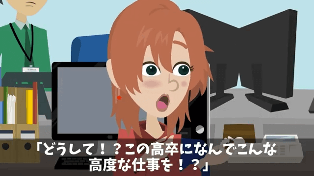 話を聞いた社長は、主人公にこの案件を担当してほしかったと言いました。 それを聞いた後輩は「どうして!?この高卒になんでこんな高度な仕事を!?」と驚きます。