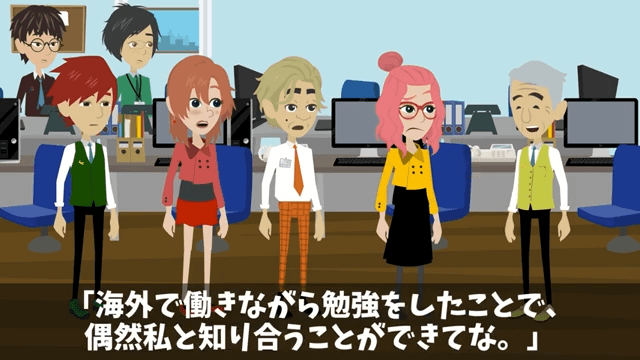社長は主人公が海外で働きながら勉強していたことを後輩に話しました。 そして社長は、すぐに主人公がとても優秀な人材だとわかったと言い…。