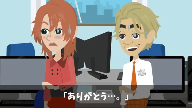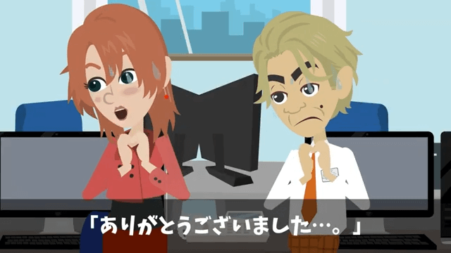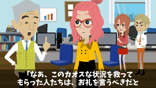 社長は後輩と男性社員に向かって「このカオスな状況を救ってもらった人たちは、お礼を言うべきだと思うが…」と言いました。 すると、後輩と男性社員がしぶしぶ主人公にお礼を言い…。
