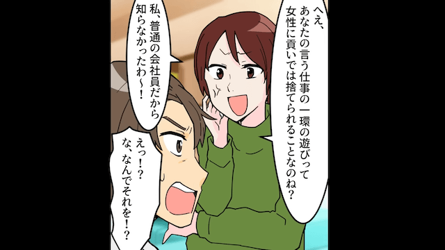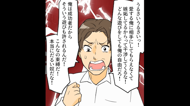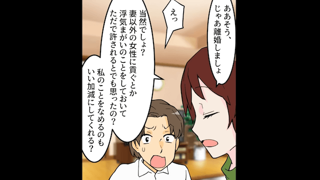 主人公が浪費ばかりする夫に注意すると、夫は「俺が遊び歩いているのは仕事の一環なの!」と主張し、開き直って「これからは俺の遊び方に口出しするなよ?」と言ってきました。 しかし夫が女性と旅行していることを知っていた主人公は、浮気を追求して離婚を提案したのです。