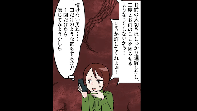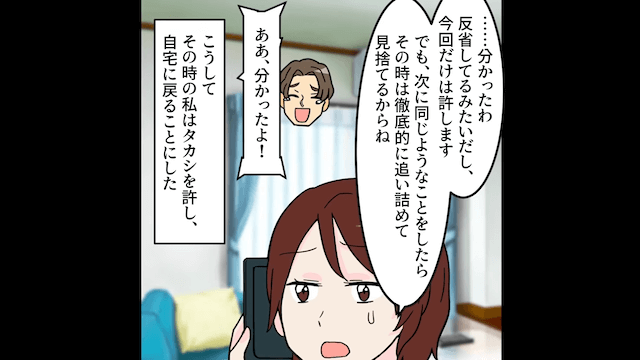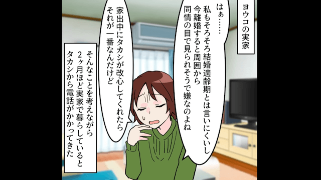 夫は「俺に捨てられたら金に困るのはそっちのくせに」と言って離婚を阻止しようとしてきましたが、主人公は夫より年収が高いことを告げ、唖然としている夫を無視して家を出ました。 そして2ヶ月後、お金の管理ができない夫が謝罪をしてきたため、主人公は今回だけ許すことにして…。