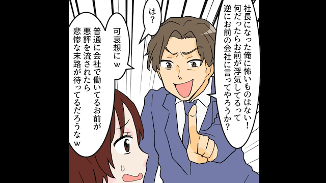 今回は『社長の夫「俺に捨てられたら生きていけない(笑)」妻「離婚で」』を紹介します。 社長になった夫は、主人公から浮気について責められても強気の態度を取り続けました。 そして「裁判を起こしても逆にお前に慰謝料請求してやる!」と主人公を脅したのです。