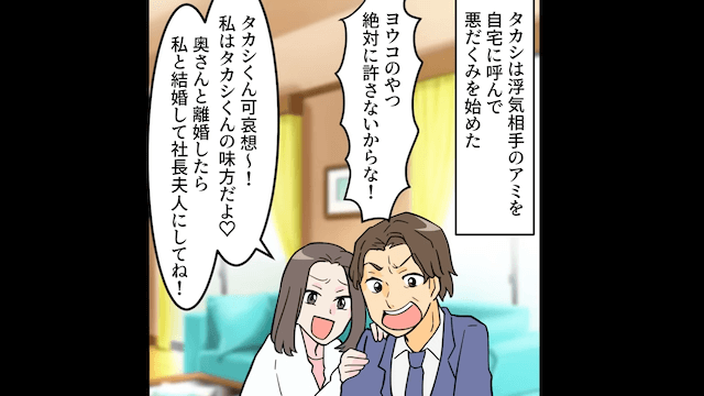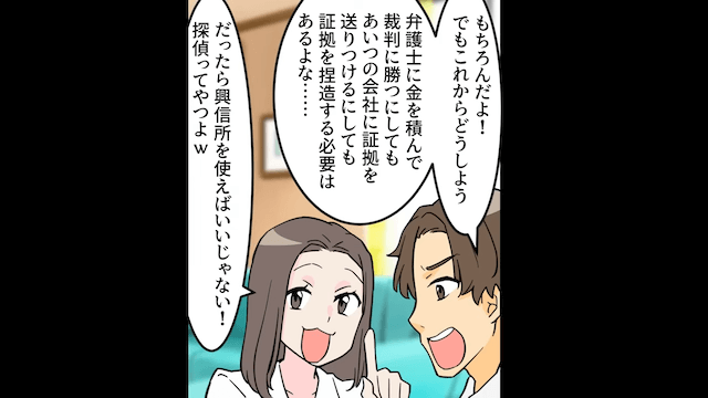 主人公が家を出た後、主人公への反撃を決意した夫は、裁判に勝つために主人公の浮気の証拠を捏造することにしました。 そして主人公の職場についての情報を得ようとするのですが、家には手がかりがなく…。