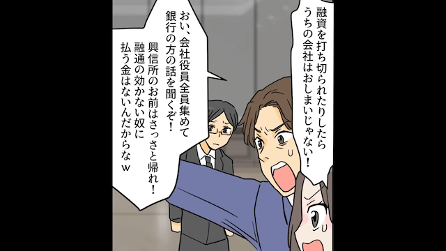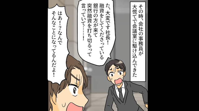 夫は職場に探偵を呼び出し、主人公の浮気の証拠を捏造するよう頼みましたが、きっぱりと拒否されてしまいました。 するとそのとき、事務員が慌てた様子でやってきて「大変です社長!融資をしてくださっている銀行の方が来て、突然融資を打ち切るって言っていて…」と言ったのです。