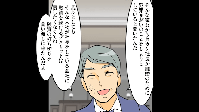 今回は『社長の夫「俺に捨てられたら生きていけない(笑)」妻「離婚で」』を紹介します。 事務員から「大変です社長!融資をしてくださっている銀行の方が来て、突然融資を打ち切るって言っていて…」と報告され、慌て始める夫。 するとそこに、銀行職員である主人公がやってきて…。