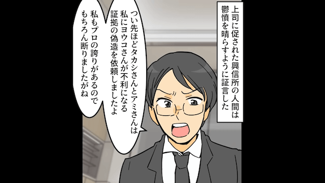 融資を打ち切られそうになった夫は、悪事についてシラを切ろうとしました。 しかし主人公が音声の証拠を持っており、探偵も夫と浮気相手の悪事を証言したため、夫は言い逃れができなくなったのです。