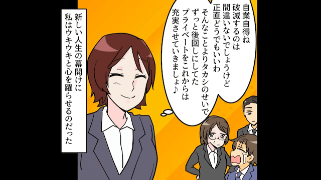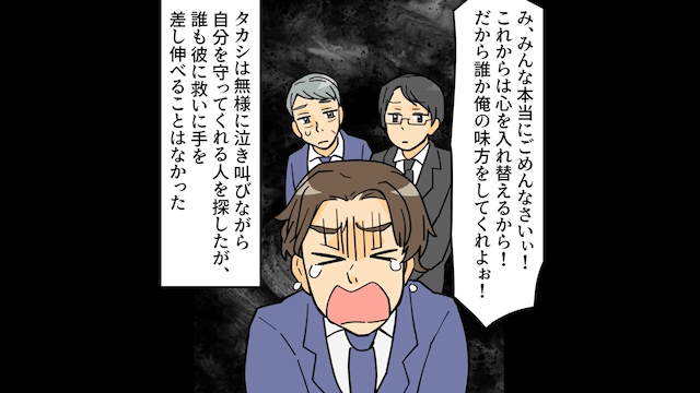 役員たちからスパイの容疑で問い詰められた浮気相手は、悪事を認めてその場から逃げていきました。 一方、夫は「俺の味方をしてくれ!」と主人公にすがりますが、主人公が許すはずもなく…。