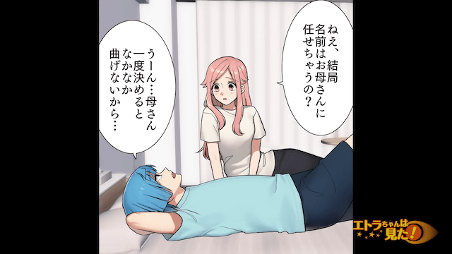 主人公が義両親に妊娠を報告すると、義母が子どもの名前を考えるつもりで「私に任せておきなさい!」と言ってきました。 その後、心配になった主人公が夫に「名前はお母さんに任せちゃうの?」と尋ねると、夫は「もし変わった名前なら僕らでアレンジすればいいし」と言い…。