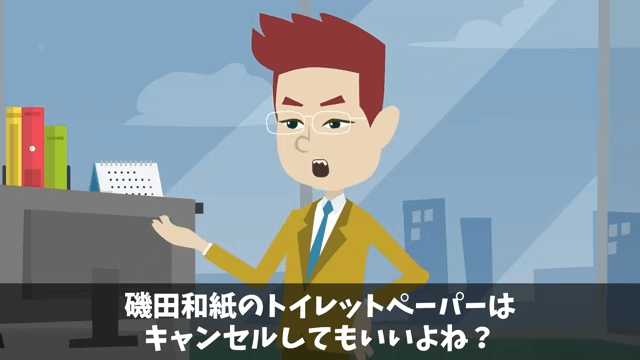 すでにほかのところにトイレットペーパーを発注していた担当者は、主人公の会社への発注をキャンセルしていいかと社長に確認しました。 そして、社長から許可を得た担当者は「これで経費削減で4億も削れる」と喜んだのです。
