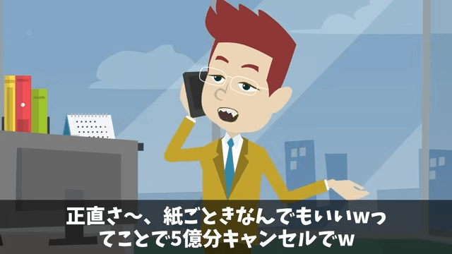 今回は『高級ホテル「ペーパーの納品5億円分キャンセルで!」取引先のオレ「はーい」⇒ライバルホテルに納品した結果』を紹介します。 納品前日、担当者から半値での契約に変更したいと言われた主人公は「それはちょっと…」と言いました。 すると担当者が「だったら契約終了だね」と言ってきて…。