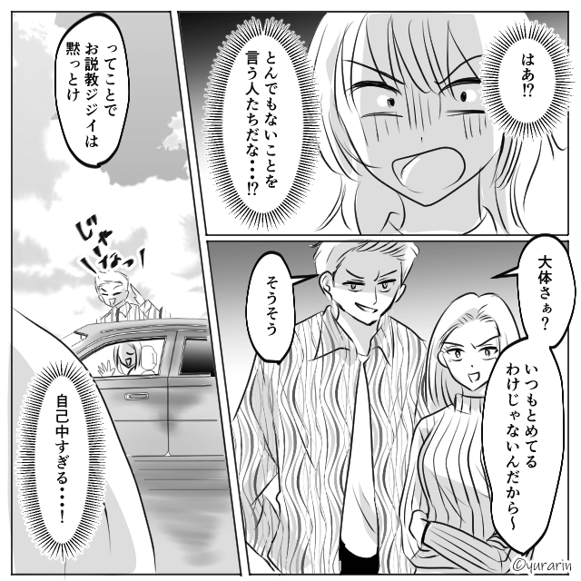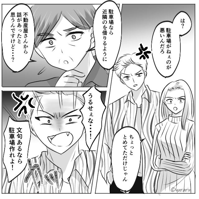 数日後、家の前の道に無断駐車されている車があり、大家と困り果てていた主人公。 するとそこに車の持ち主である、クレーマーの女性とコンビニで絡んできた男性がやってきます。