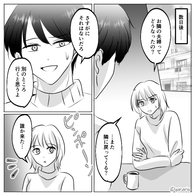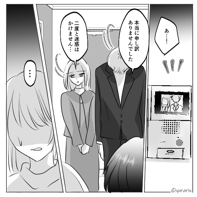 その後、被害届が出されたことで、警察に連行された隣人。 すると数日後、隣人が主人公に謝罪に来たのでした。