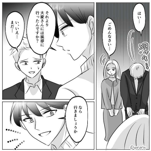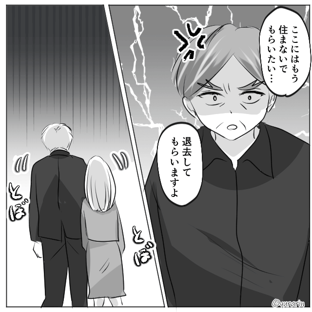 今回は『カスハラ常習犯の正体』を紹介します。 数日後、主人公の家にやってきた隣人。 スーツを着た隣人は、主人公に頭を下げ…。