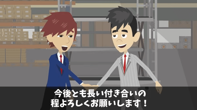 今回は『高級ホテル「ペーパーの納品5億円分キャンセルで!」取引先のオレ「はーい」⇒ライバルホテルに納品した結果』を紹介します。 驚いている様子の主人公に、オーナーは「どうですか?我が社と契約。お願いデキマスカ?」と言いました。 すると主人公は「も、もちろんです!」と答え、オーナーと握手をしたのです。