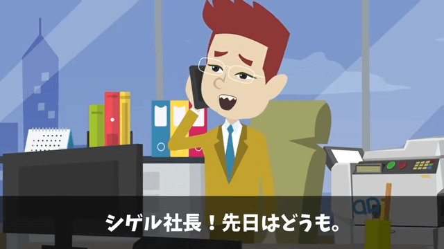女性社員は取引先の担当者から電話が来ていることを主人公に伝えました。 そして主人公が電話を代わると、担当者は「先日はどうも」と話し始めて…。