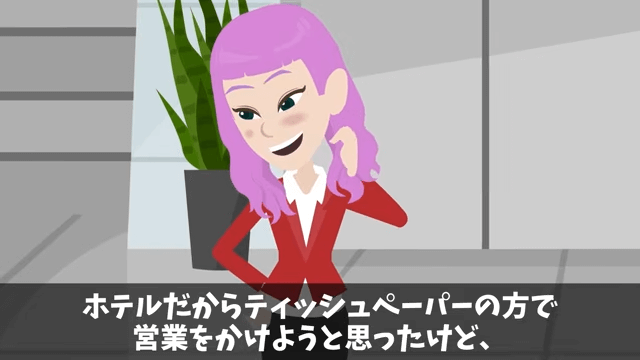 今回は『高級ホテル「ペーパーの納品5億円分キャンセルで!」取引先のオレ「はーい」⇒ライバルホテルに納品した結果』を紹介します。 担当者がほかの会社と契約を交わすことを考えていると、そこに製紙会社の営業の女性がやってきました。 そして担当者が「製紙会社!?ってことはトイレットペーパー!?」と言うと…。