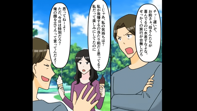 今回は『夫と義家族が旅行先で好き勝手した話』を紹介します。 主人公は夫と2人で旅行する予定でしたが、なぜか義母と義妹もついてくることになりました。 しかも夫は義母たちの宿泊費をすべて主人公に立て替えさせようとしていて…。