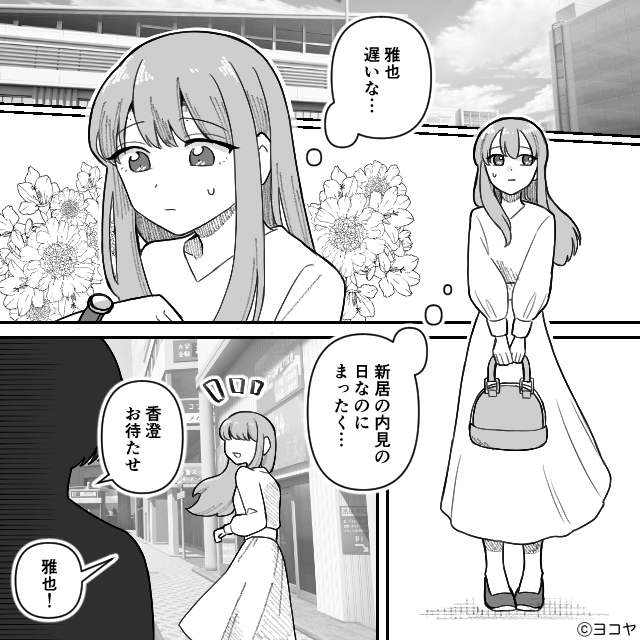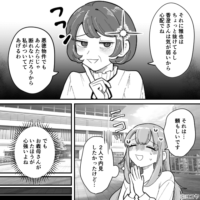 今回は『親離れできない夫との“異常な”新婚生活』を紹介します。 新居の内見に行くため、夫を待っていた主人公。 「お待たせ」とやってきた夫は、義母も連れてきていて…。
