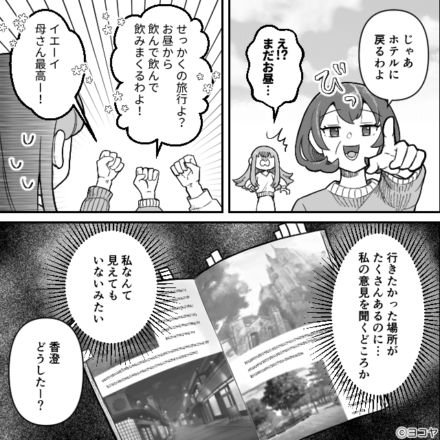 旅行初日、義母に「あなたは家族じゃないから」と言われ、写真に写ることを許してもらえなかった主人公。 その後も主人公の存在は無視され、主人公は「これって本当に新婚旅行…?」とモヤモヤします。