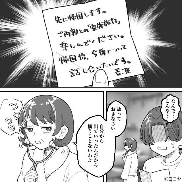 今回は『親離れできない夫との“異常な”新婚生活』を紹介します。 新婚旅行でつらい思いをし、途中で帰っていた主人公。 今後の夫との関係を、改めて考え…。