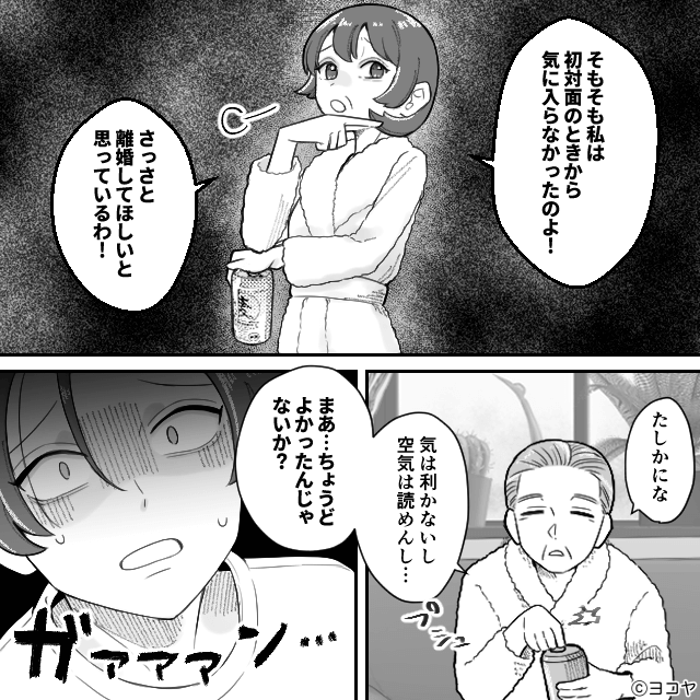 主人公がいなくなったことで夫は青ざめますが、義母は「これでやっと家族だけの旅行になったわね」と喜びます。 その発言に夫が衝撃を受けていると、義両親は夫に離婚を勧め…。