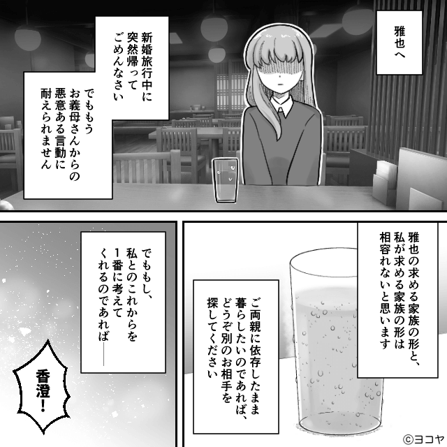 今回は『親離れできない夫との“異常な”新婚生活』を紹介します。 「今後どうするかはあなたたち2人で考えなさいね」と家族に言われ、主人公からの封筒を受け取った夫。 封筒の中には手紙と離婚届が入っていて、夫は驚愕するのでした。