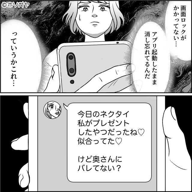 違和感を抱いた主人公が夫のスマホを確認すると、浮気が発覚し…。