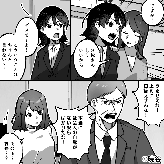 少しのミスでも、主人公に長々と説教をしてくる上司。 他の社員が女性社員も同じミスをしていたことを指摘すると、上司は「彼女は問題ないんだよ!」と言い張りました。