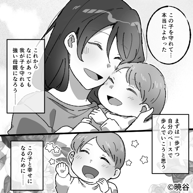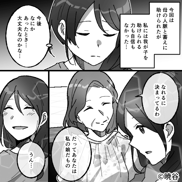 数ヶ月後、なにもかもを失って絶望していた夫。 一方、主人公は助けてくれた母に感謝し、母のような強い母親になろうと決心するのでした。