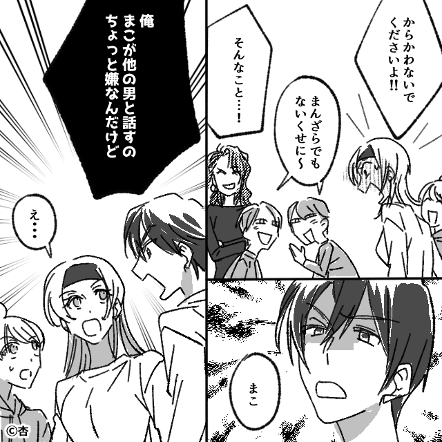 主人公が照れるとサークルメンバーの男性たちがからかったのですが、その様子を見て彼氏は嫉妬し…。