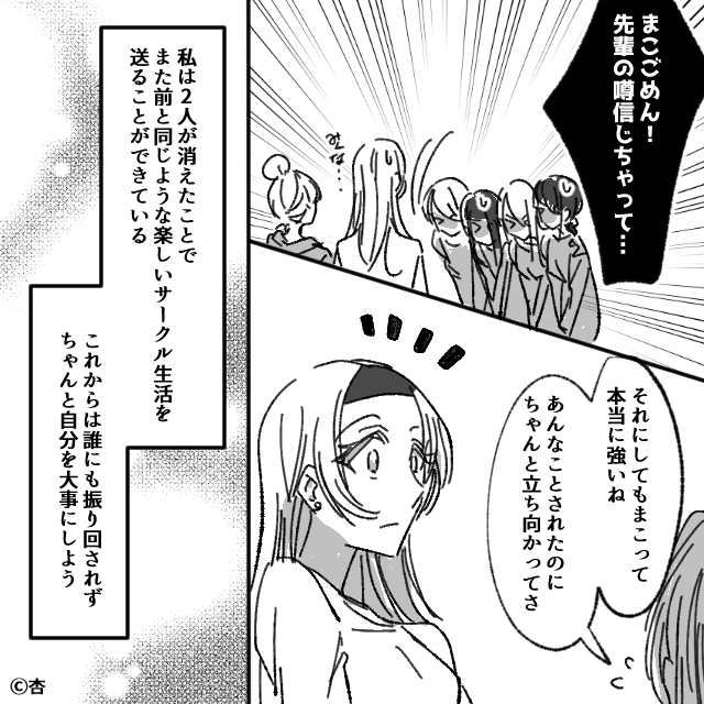 一方、主人公はサークルメンバーから謝罪され、以前と同じように楽しいサークル生活を送ることができたのでした。