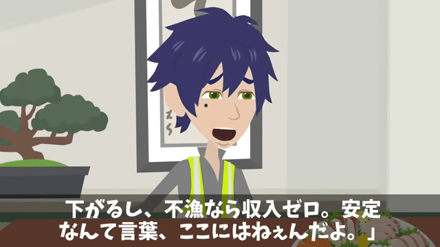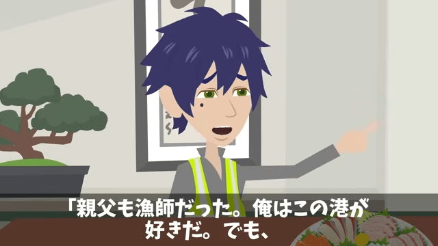 食事をご馳走になった主人公は「こんなにうまい魚、初めて食べました…!」と若い漁師に伝えました。 すると若い漁師は「こんだけうまい魚を獲っても、俺たちの暮らしは、一向に楽にならねえんだ」と言い、このままでは息子にこの仕事を継がせることはできないと話して…。