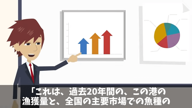主人公は漁港が抱える問題についての自分なりの答えをみんなに見せたいと言います。 そして主人公は壁に1つのグラフを映し出し、説明を始めたのです。