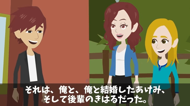 女性社員と結婚した主人公は、女性社員と後輩を連れて再建した漁港へ向かおうとしていました。 そしてその旅の途中、偶然立ち寄った場所に同僚がいたのです。