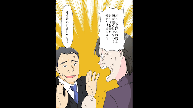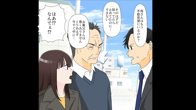 主人公からお金の返済を求められたものの、それを渋って一方的に電話を切った義母。 その後、主人公が義父と夫とともに不動産屋へ向かうと、義母と不動産屋が揉めていて…。