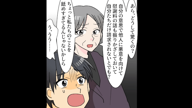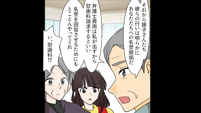 夫は嘘をつき続ける義姉を慌てて止め、家の主が社長であることを説明しました。 しかしもう手遅れで、夫たちの言動に怒った社長は、主人公と母に「弁護士費用は私が出すから慰謝料請求するといい」と言ってくれたのです。