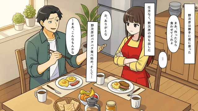 夫は離婚したにもかかわらず、家に居座るつもりのようです。 そして翌朝、朝食を食べた夫は「もう少し工夫できると思うけど」と文句を言ってきたのです。