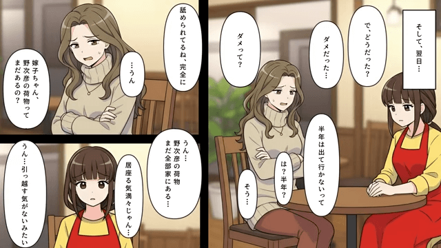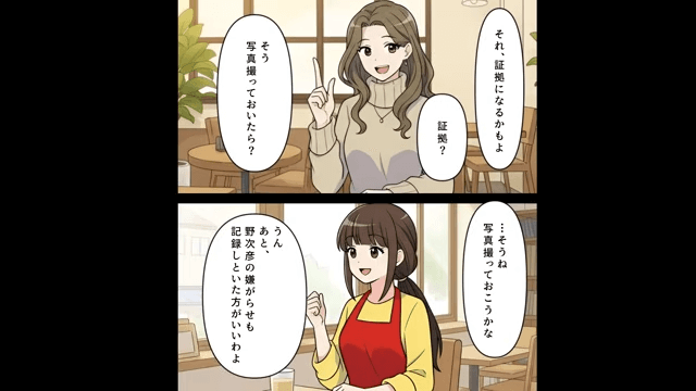 話し合いの結果、主人公は夫がしばらく家を出て行くつもりがないことを知りました。 そこで主人公が友人に相談すると、友人は夫の嫌がらせの記録を残しておいたほうがいいとアドバイスをしてくれて…。
