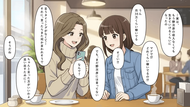 数日後、主人公は再び友人とカフェで会うことになりました。 そして主人公は、もう夫の収入に頼らずとも生きていけるくらい稼いでいることを友人に話したのです。
